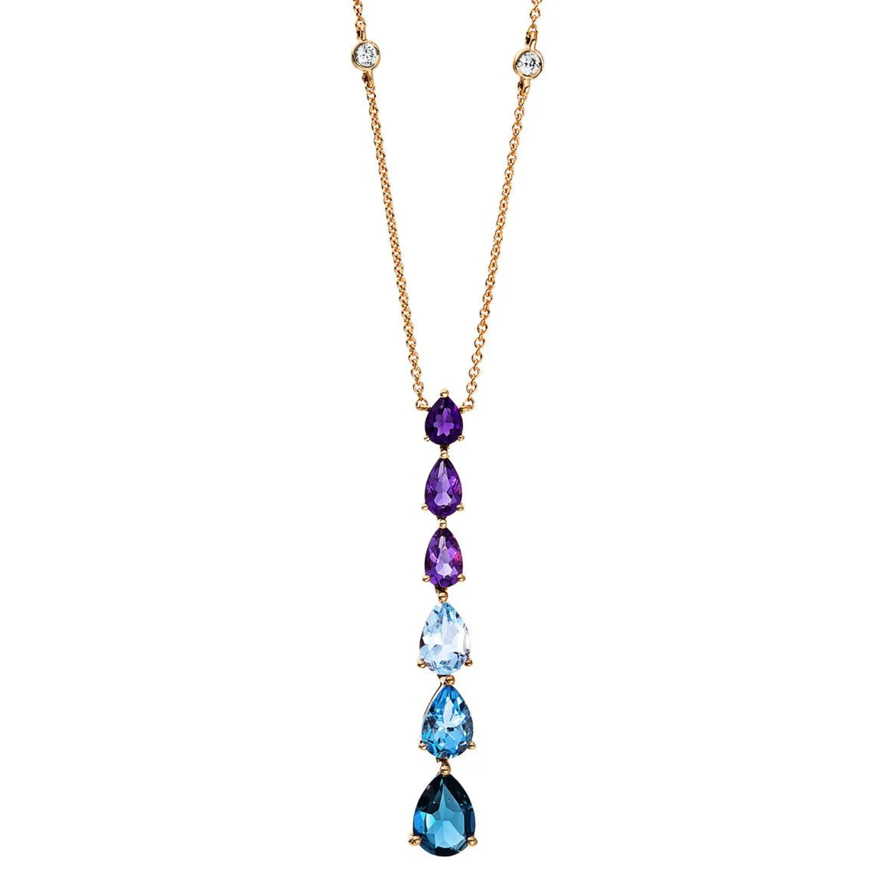 Collier 18 kt RG, 2 Brillanten 0,04 ct, TW-si, 1 Blautopas 0,71 ct Lond. blue, 1 Amethyst 0,19 ct lila, 2 Blautopase 1,01 ct blau, H:37,2 mm, B:5,7 mm