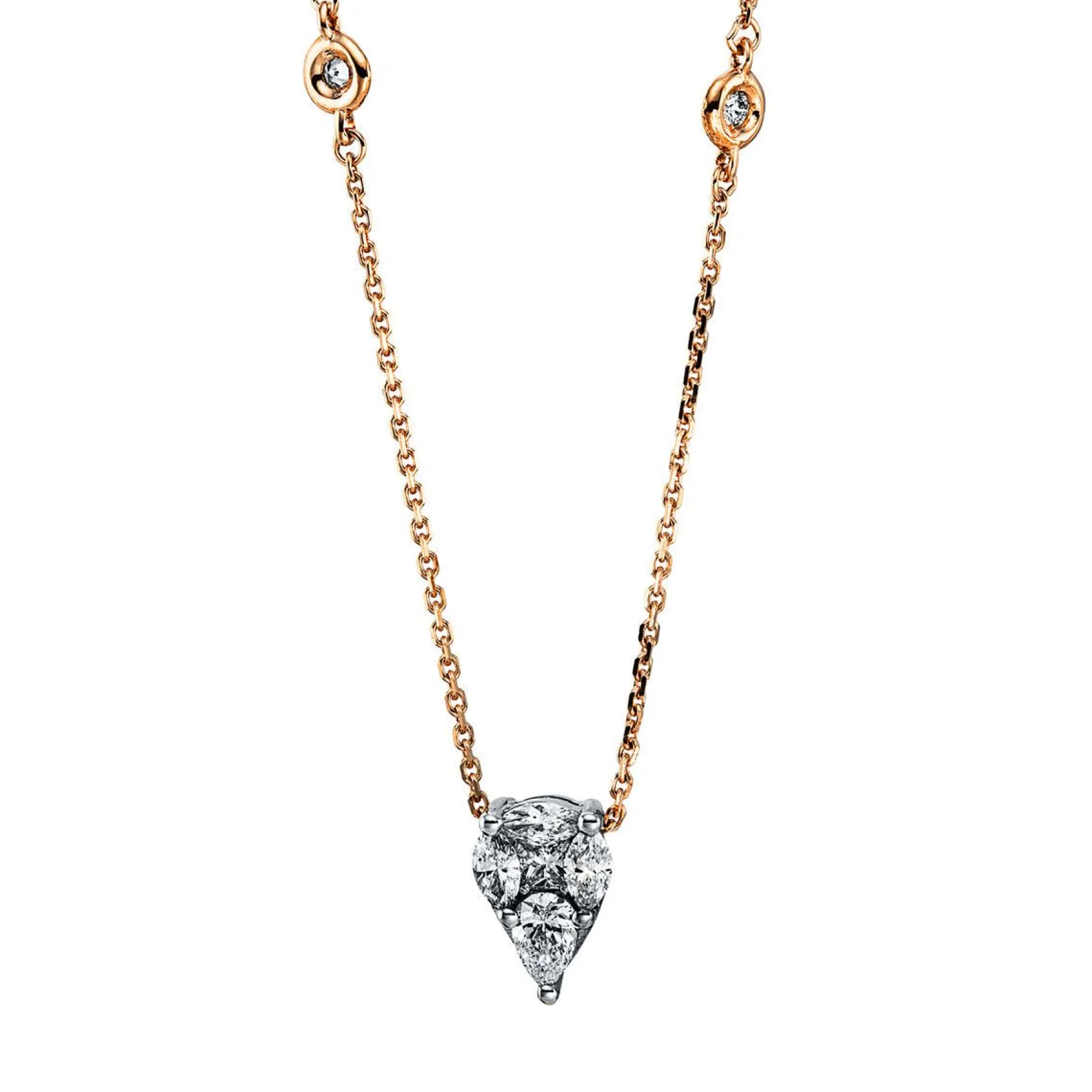 Collier 18 kt RG, 3 Navette 0,19 ct, TW-vsi/si, 1 Tropfen 0,15 ct, TW-vsi/si, 1 Princ. 0,07 ct, TW-vsi/si, 2 Brillanten 0,04 ct, TW-vsi/si, L:42,0 cm