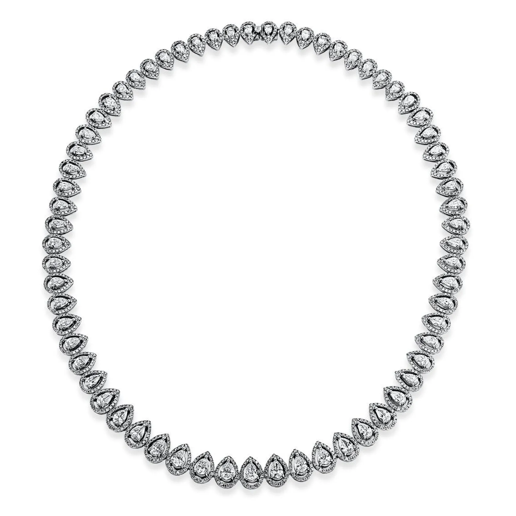 Collier 18 kt WG, 56 Tropfen 8,59 ct, TW-vsi, 9 Tropfen 2,87 ct, TW-vsi, 1218 Brillanten 5,23 ct, TW-vsi, L:43,2 cm