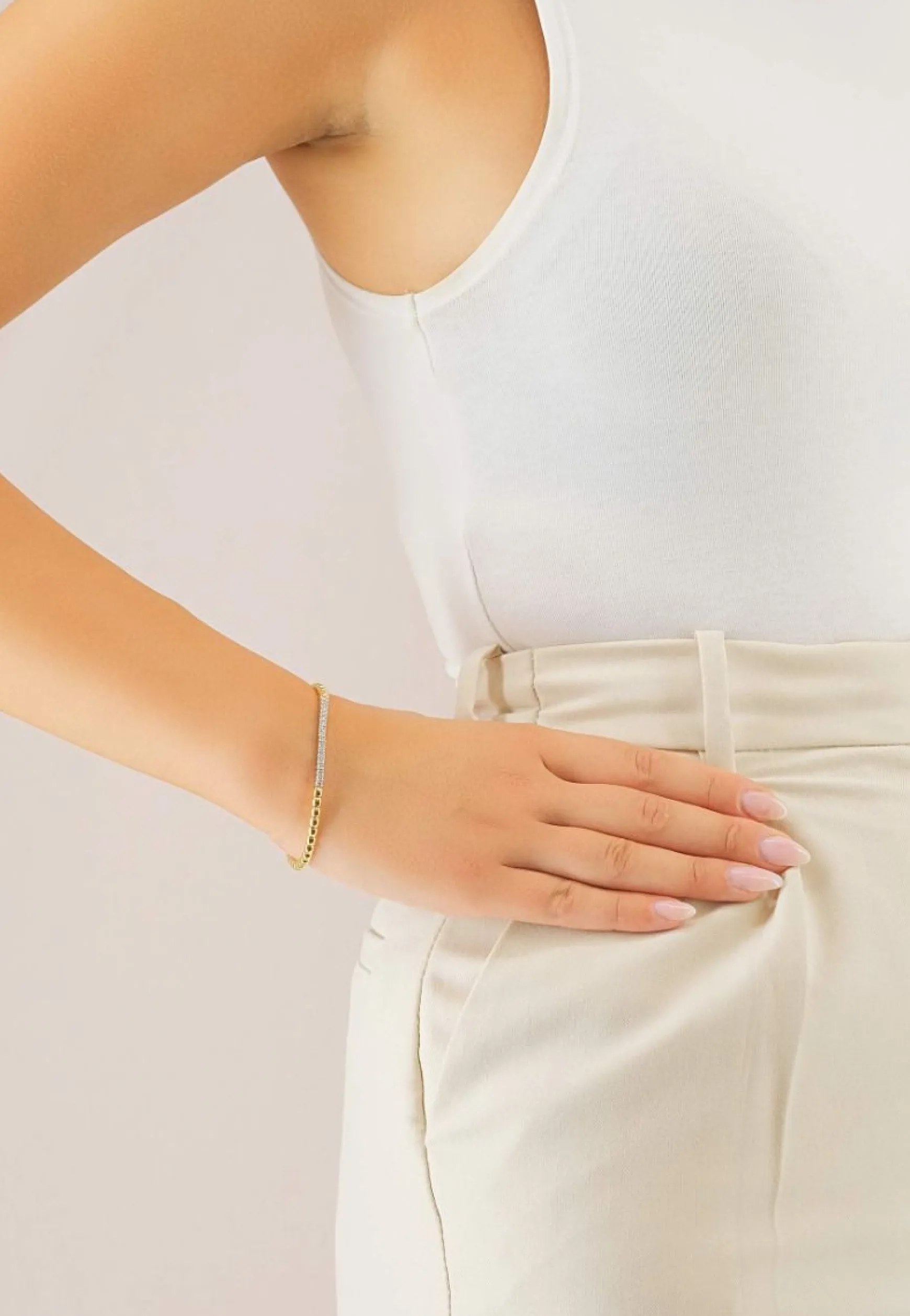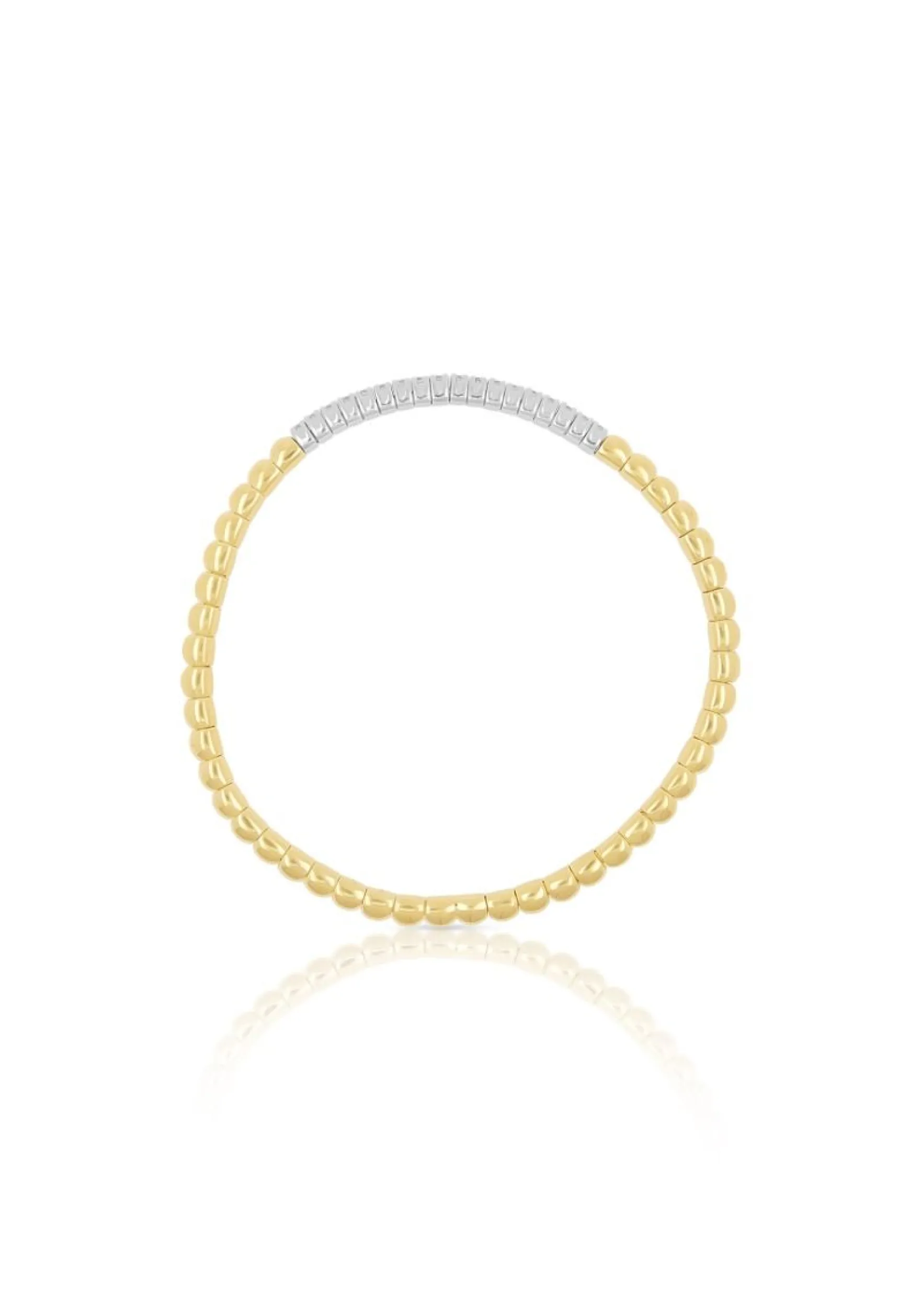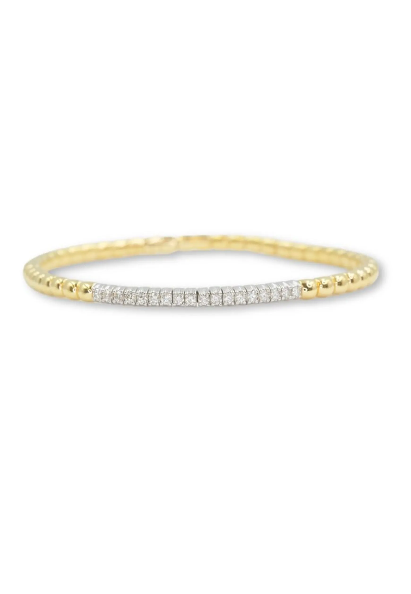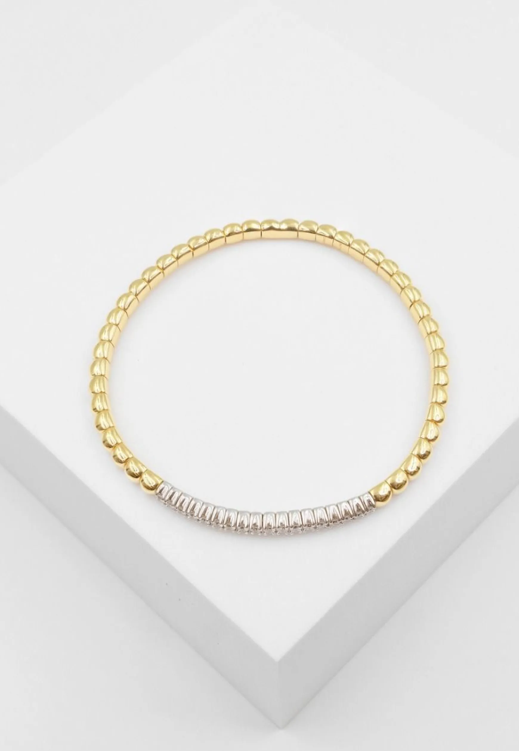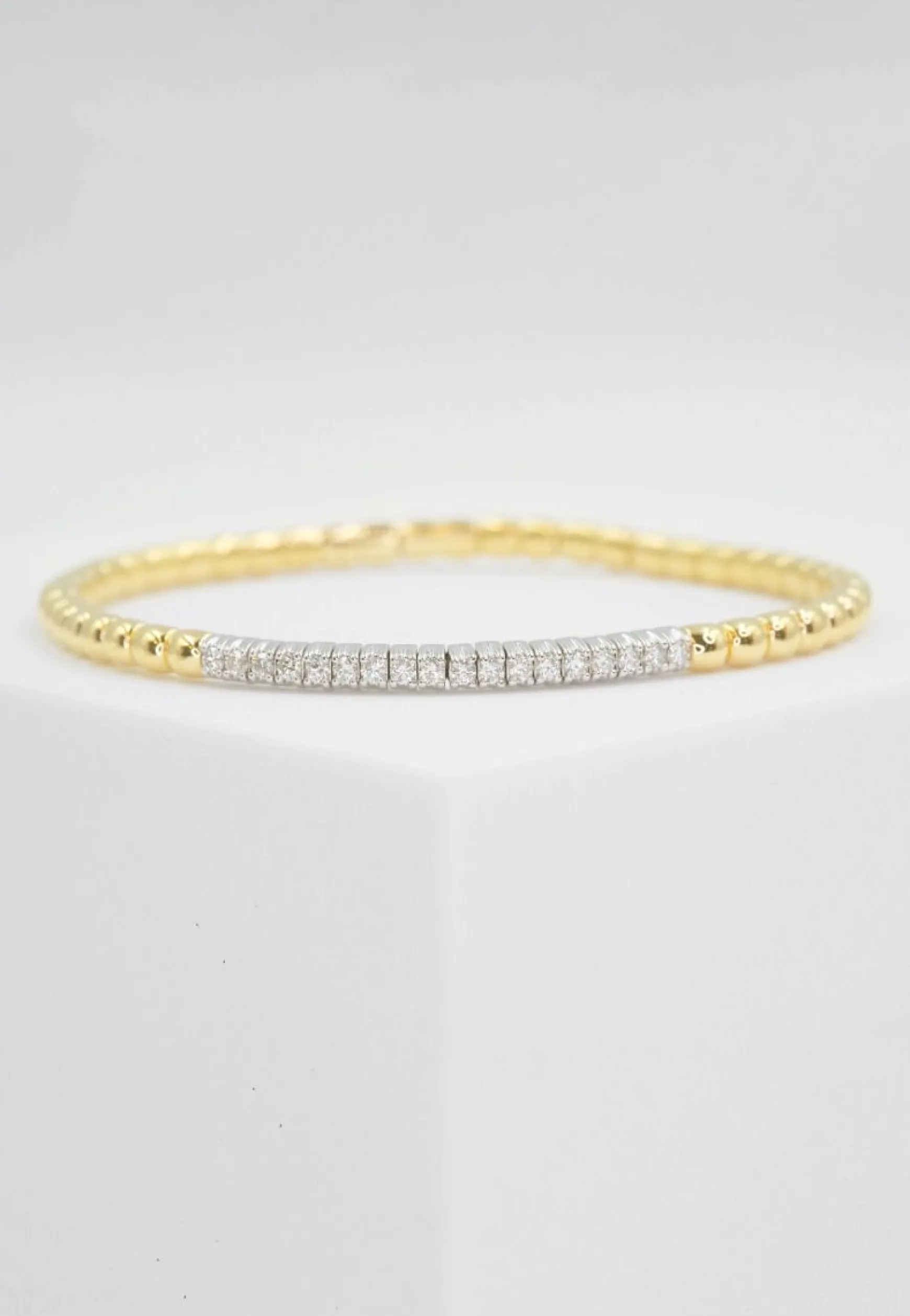 Das Flexarmband aus 750/18K Bicolor-Gold vereint zeitlose Eleganz mit höchstem Tragekomfort. Die Kombination aus warmem Gelbgold und edlem Weißgold verleiht dem Schmuckstück eine besondere Raffinesse. Besetzt mit 18 funkelnden Diamanten von insgesamt 0.40 ct, setzt dieses Armband stilvolle Akzente. Mit einer Länge von 17 cm passt es sich durch seine flexible Verarbeitung angenehm dem Handgelenk an. Ein edles Accessoire für besondere Anlässe und den täglichen Luxus.