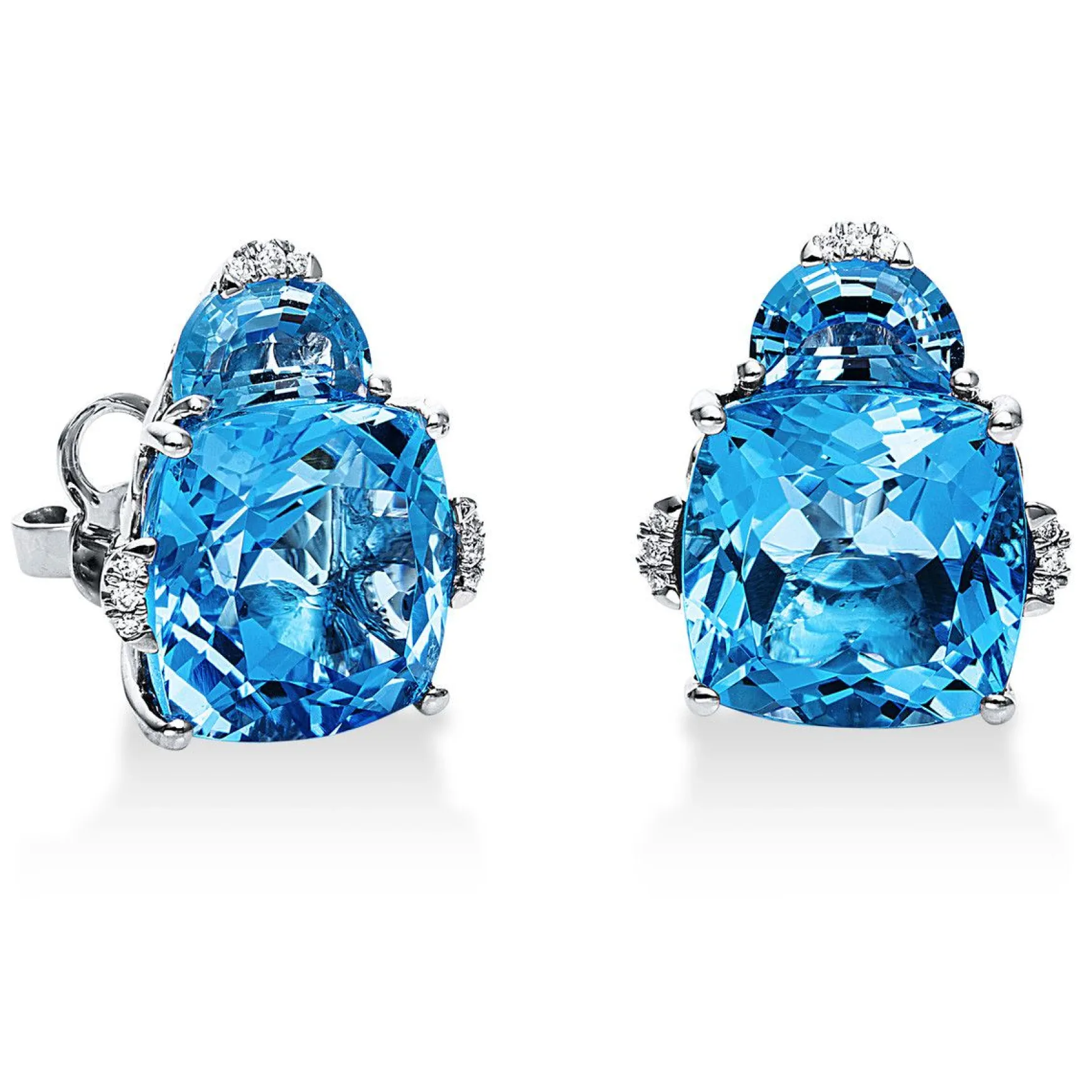 Ohrstecker 4er-Krappe 18 kt WG, 18 Brillanten 0,07 ct, TW-si, 2 Topase 1,70 ct blau, 2 Topase 15,90 ct blau, H:16,1 mm, B:13,8 mm