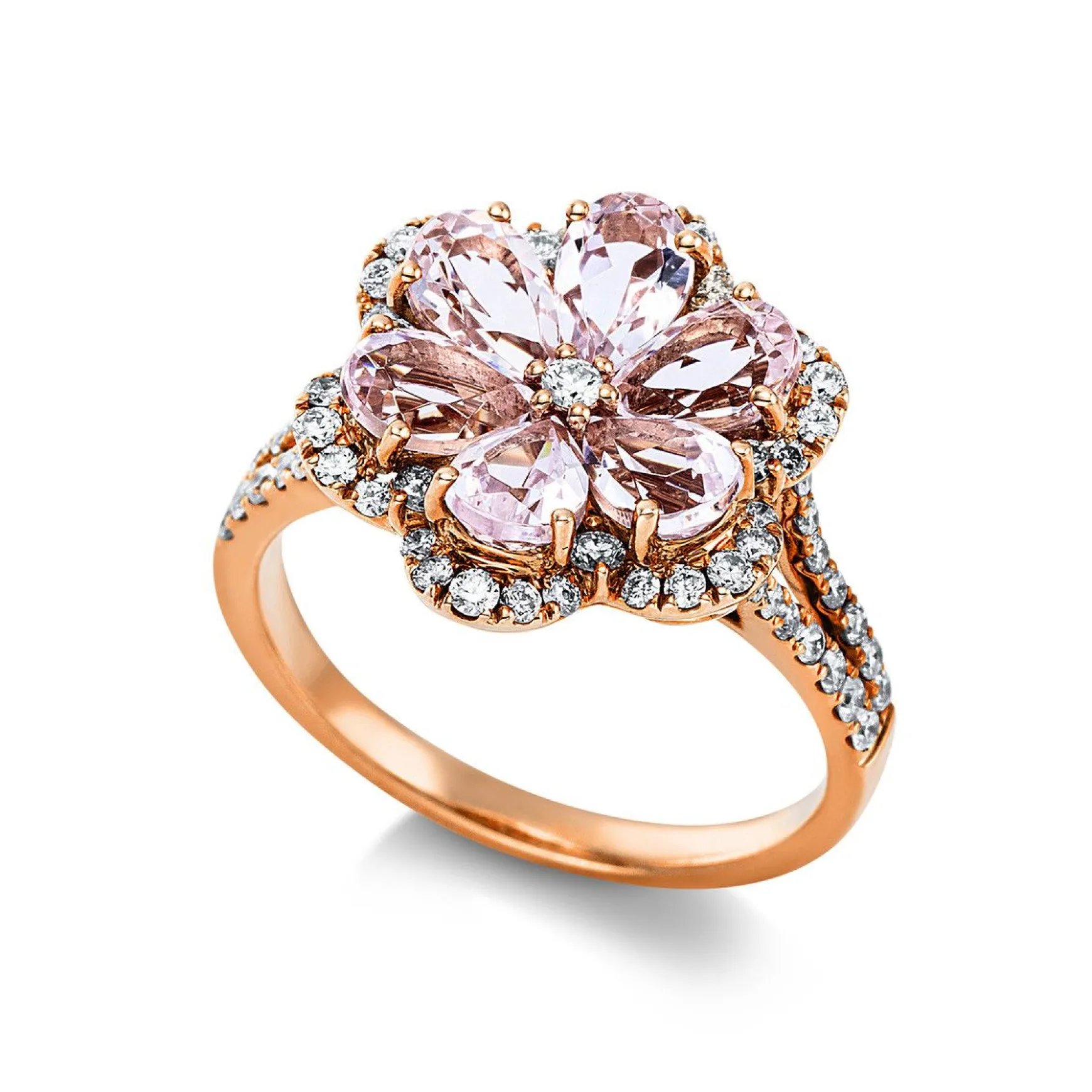 Ring 18 kt RG, 65 Brillanten 0,57 ct, TW-si, 6 Morganit 2,09 ct pink, Ø:15,5 mm, Weite:53