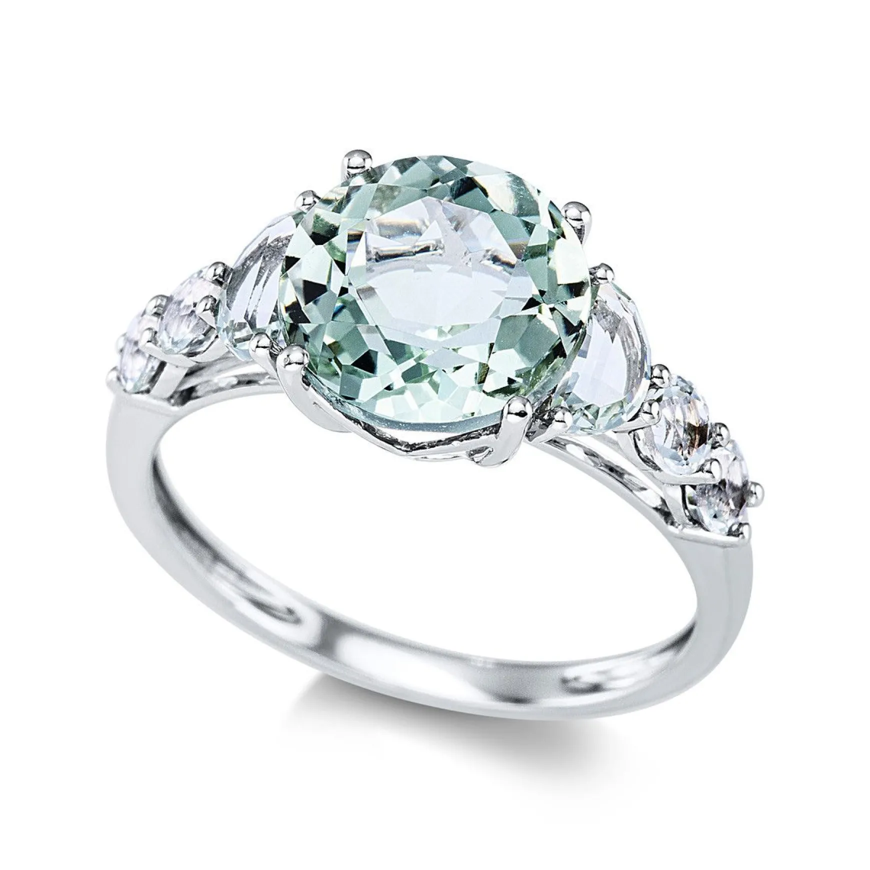 Ring 4er-Krappe 18 kt WG, 2 Amethyste 0,40 ct grün, 1 Amethyst 2,90 ct grün, 4 Amethyste 0,40 ct grün, H:20,0 mm, B:9,1 mm, Weite:54