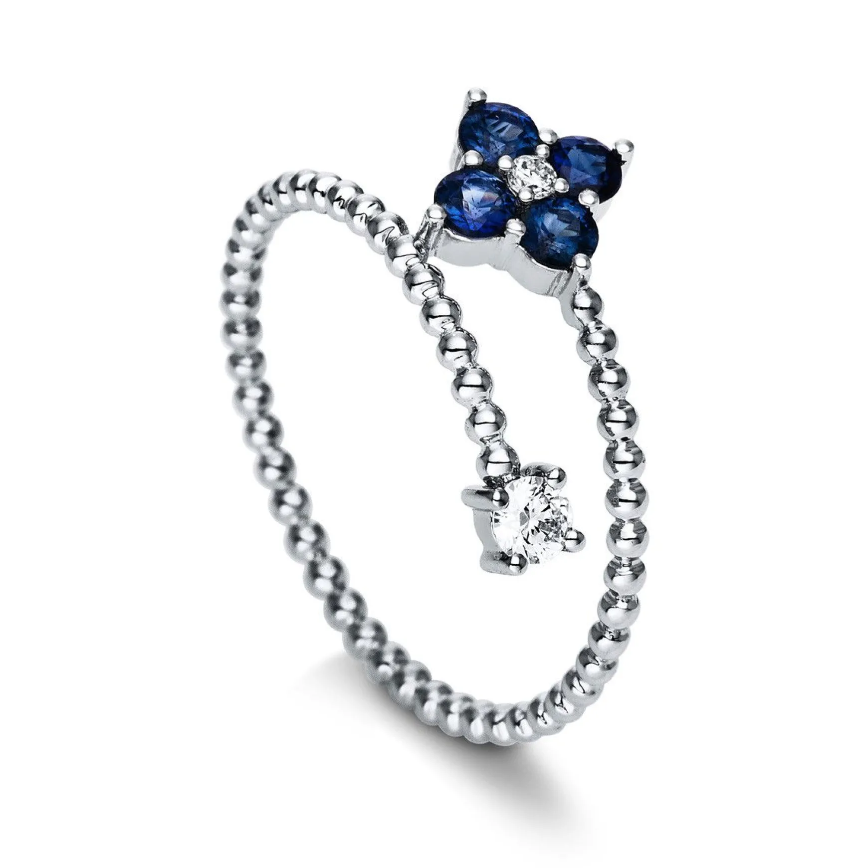 Ring 18 kt WG, 2 Brillanten 0,09 ct, TW-si, 4 Saphire 0,32 ct blau, Weite:53