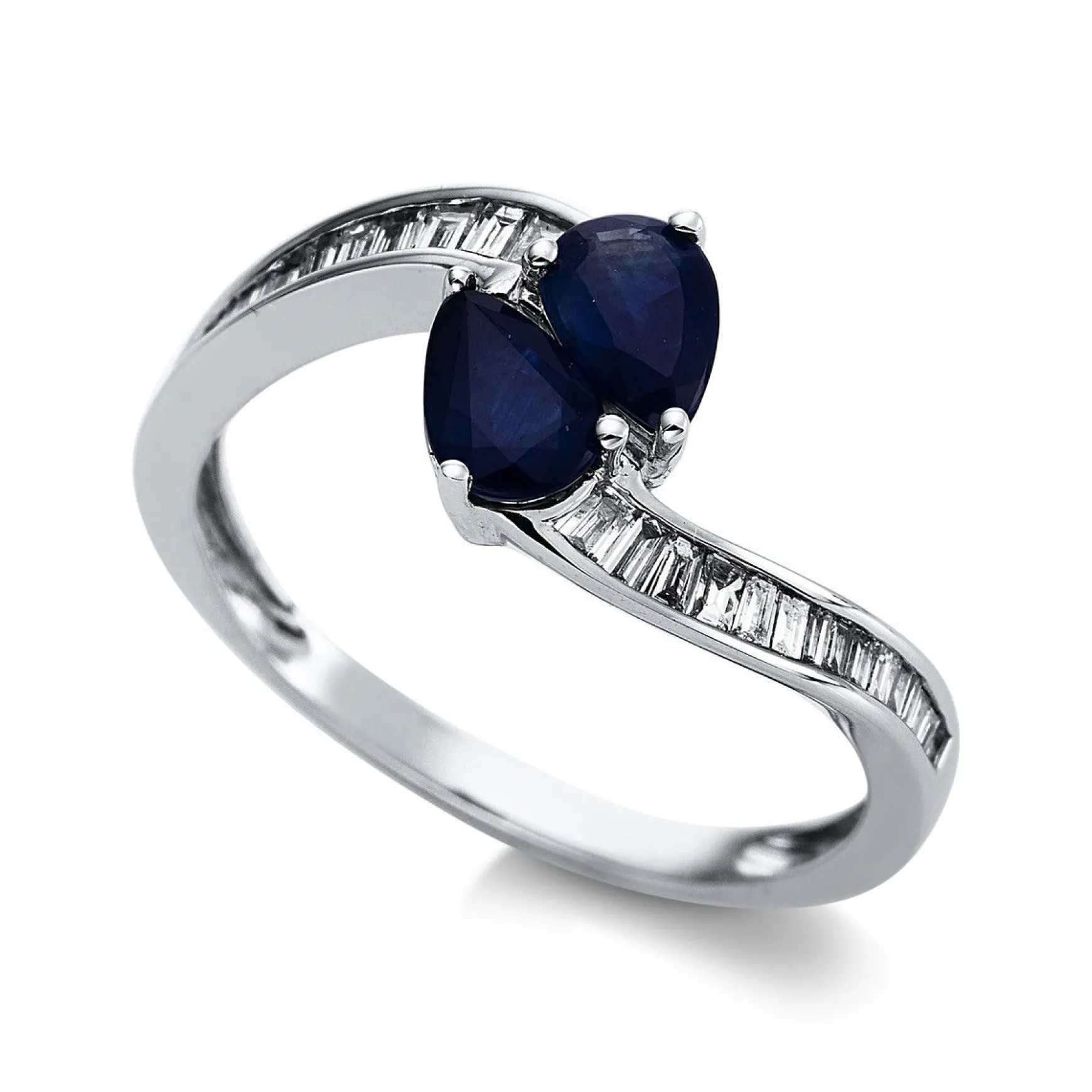 Ring 18 kt WG, 29 Baguette 0,35 ct, TW-si, 2 Saphire 0,89 ct blau, Weite:54