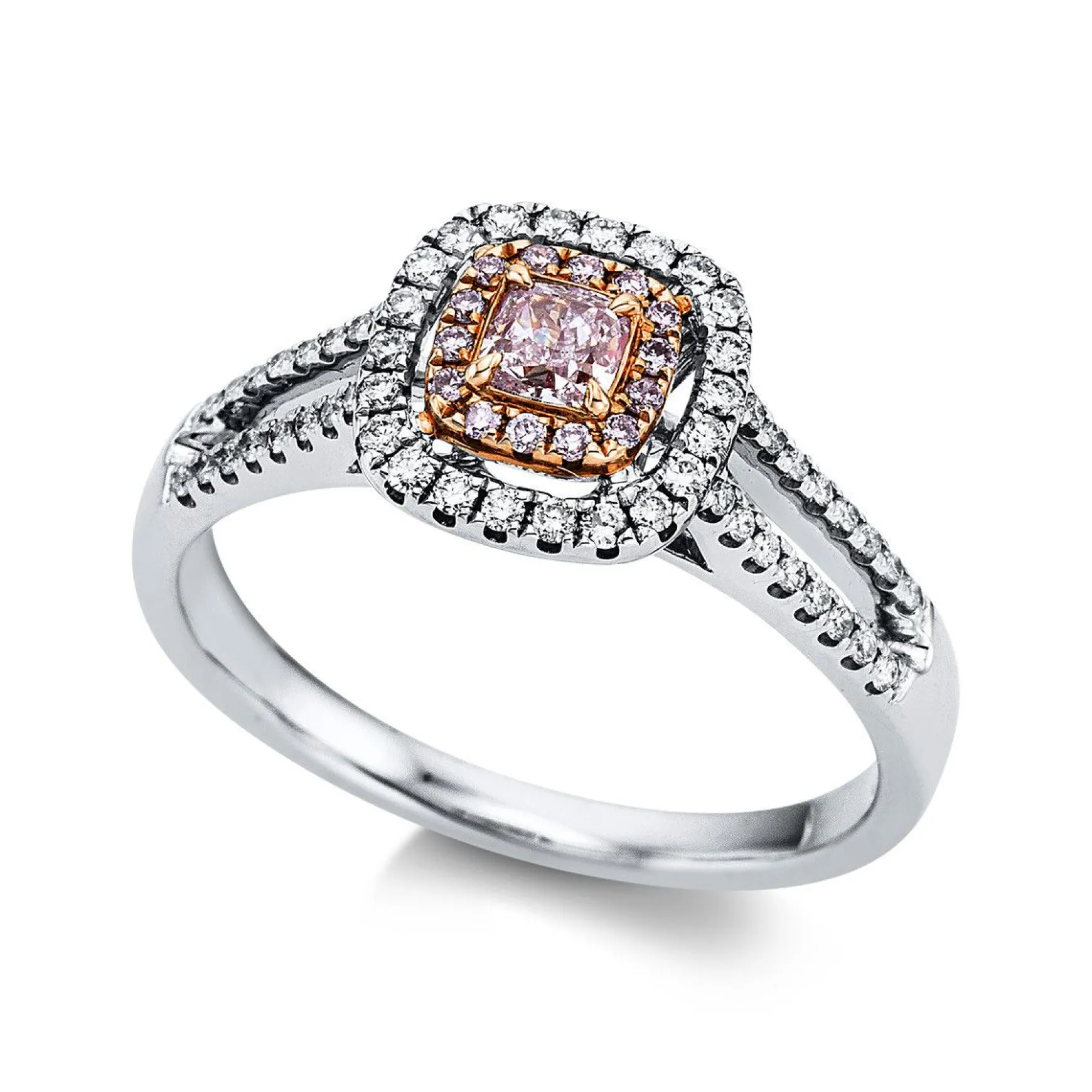 Ring 18 kt WG+RG, 50 Brillanten 0,22 ct, TW-si, 14 Brillanten 0,06 ct, pink, 1 Cushion 0,22 ct, pink, Weite:52