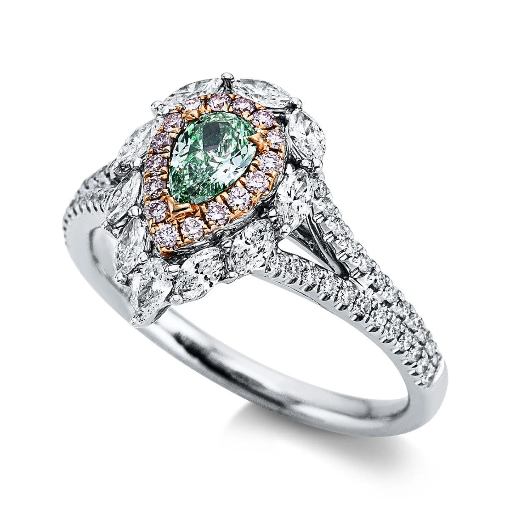 Ring 18 kt WG+RG, GIA6341854067, 48 Brillanten 0,16 ct, TW-si, 10 Brillanten 0,32 ct, TW-si, 1 Tropfen 0,28 ct, grün, 16 Brillanten 0,10 ct, pink, H:13,7 mm, B:9,6 mm, Weite:52