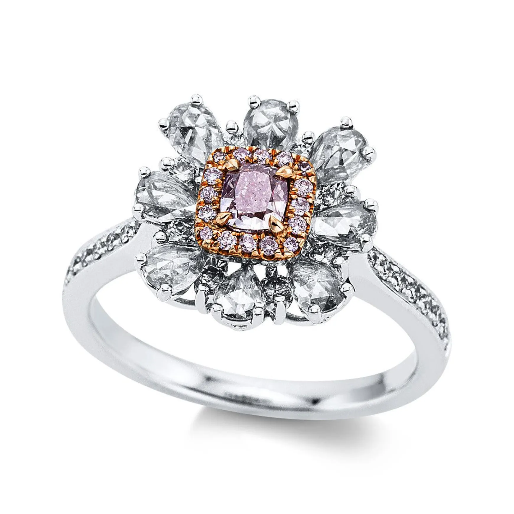 Ring 4er-Krappe 18 kt WG+RG, 32 Fant-Schl. 0,85 ct, TW-si, 1 Cushion 0,27 ct, pink, 16 Brillanten 0,07 ct, pink, Weite:51