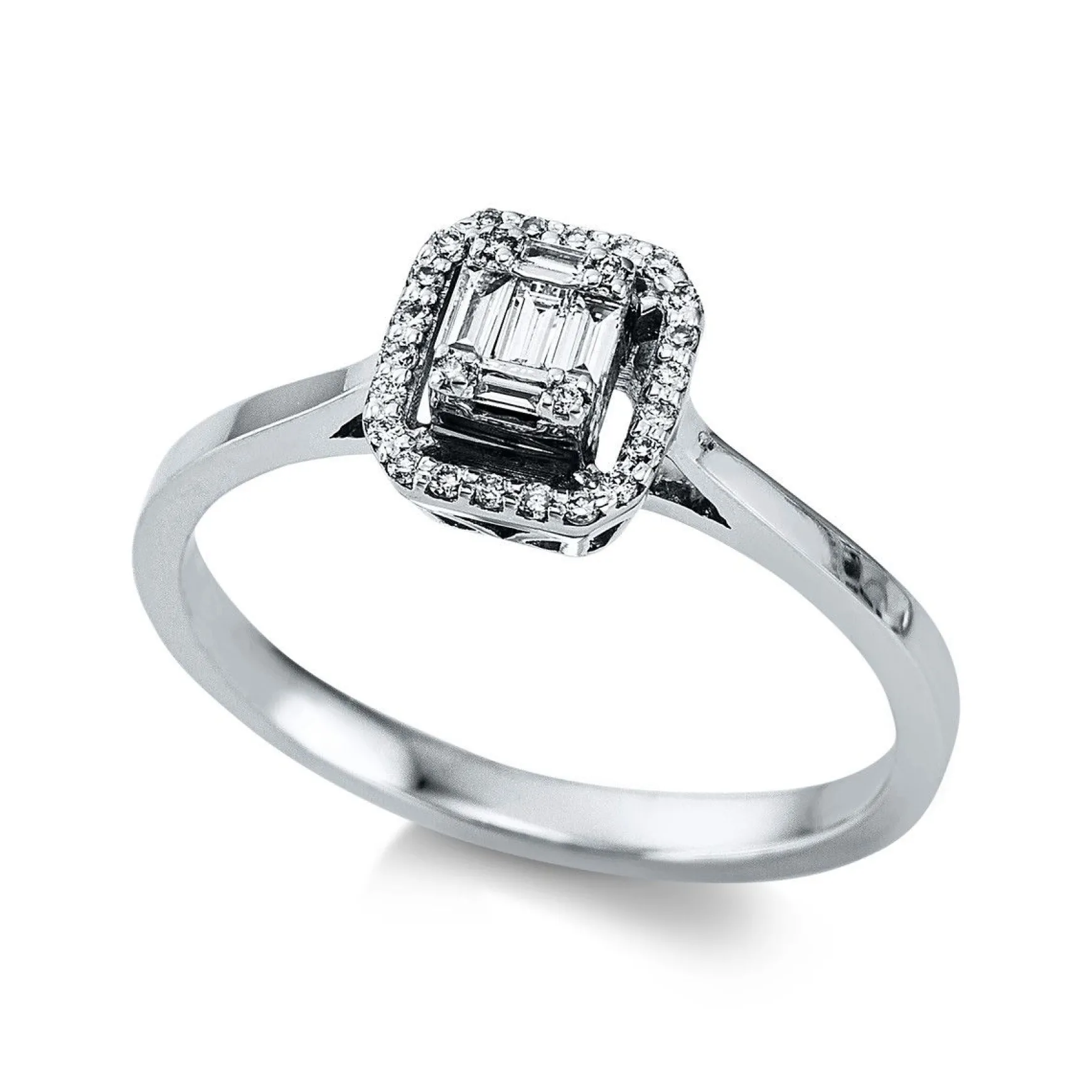 Ring 14 kt WG, 5 Baguette 0,09 ct, TW-vsi/si, 27 Brillanten 0,09 ct, TW-vsi/si, Weite:53