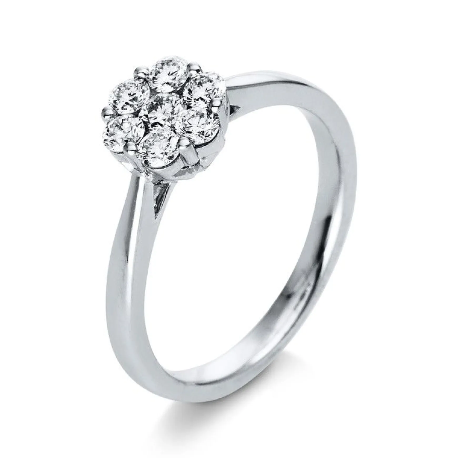 Ein Diamantring schmückt die Hand und hat eine ganz besondere Wirkung. Aus unserer Diamant Schmuck Kategorie bieten wir unzählige Schmuckstücke die zu jedem Style passen, wie dieser Verlobungsring aus 750/18K Weissgold mit einer Diamant-Steinfarbe: TW (TOP WEssELTON) Feines Weiss. Diamantschmuck einfach im Online Shop bestellen und nach Hause liefern lassen. Allgemeine Produktinformation: Verlobungsring aus 750/18K Weissgold mit 7 Diamant Steinen und 0.45 Karat. Schliffform: Brillantschliff, Steinreinheit: SI