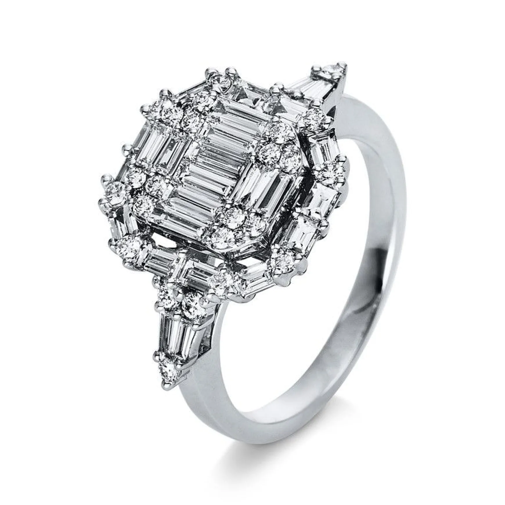 Kein Schmuck glänzt und funkelt so schön wie ein Diamantring. Diamantringe in unterschiedlichen Materialien und Formen finden Sie in unserer Diamant-Schmuck Kategorie. Entdecken Sie Diamantringe wie diesen Verlobungsring aus 750/18K Weissgold mit einer Diamant-Steinfarbe: TW (TOP WEssELTON) Feines Weiss. Holen Sie sich jetzt höchste Qualität mit unserer Selektion an Diamantschmuck. Allgemeine Produktinformation: Verlobungsring aus 750/18K Weissgold mit 56 Diamant Steinen und 1.24 Karat. Schliffform: Brillantschliff, Steinreinheit: SI