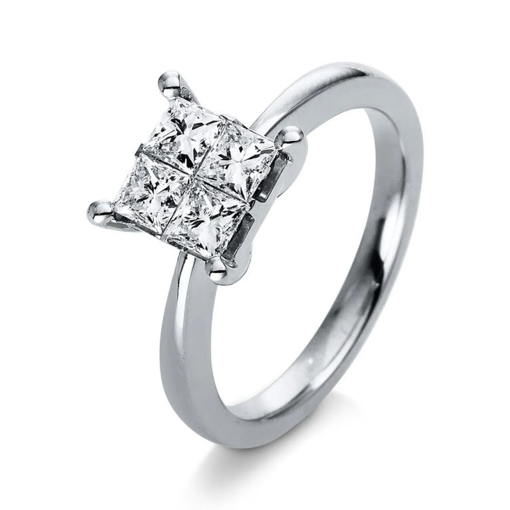 Diamantschmuck wird von vielen Kennern als das höchste der Gefühle in der Schmuck Branche geschätzt. Entdecken Sie jetzt in unserem Schmuck Shop aus unserer Diamantring Kategorien diesen Verlobungsring aus 750/18K Weissgold mit einer Diamant-Steinfarbe: TW (TOP WEssELTON) Feines Weiss. Bestellen Sie hier Ihren Diamantring bequem online, unser Spezialisten Team steht Ihnen gerne zur Verfügung. Allgemeine Produktinformation: Verlobungsring aus 750/18K Weissgold mit 4 Diamant Steinen und 1 Karat. Schliffform: Princess, Steinreinheit: SI